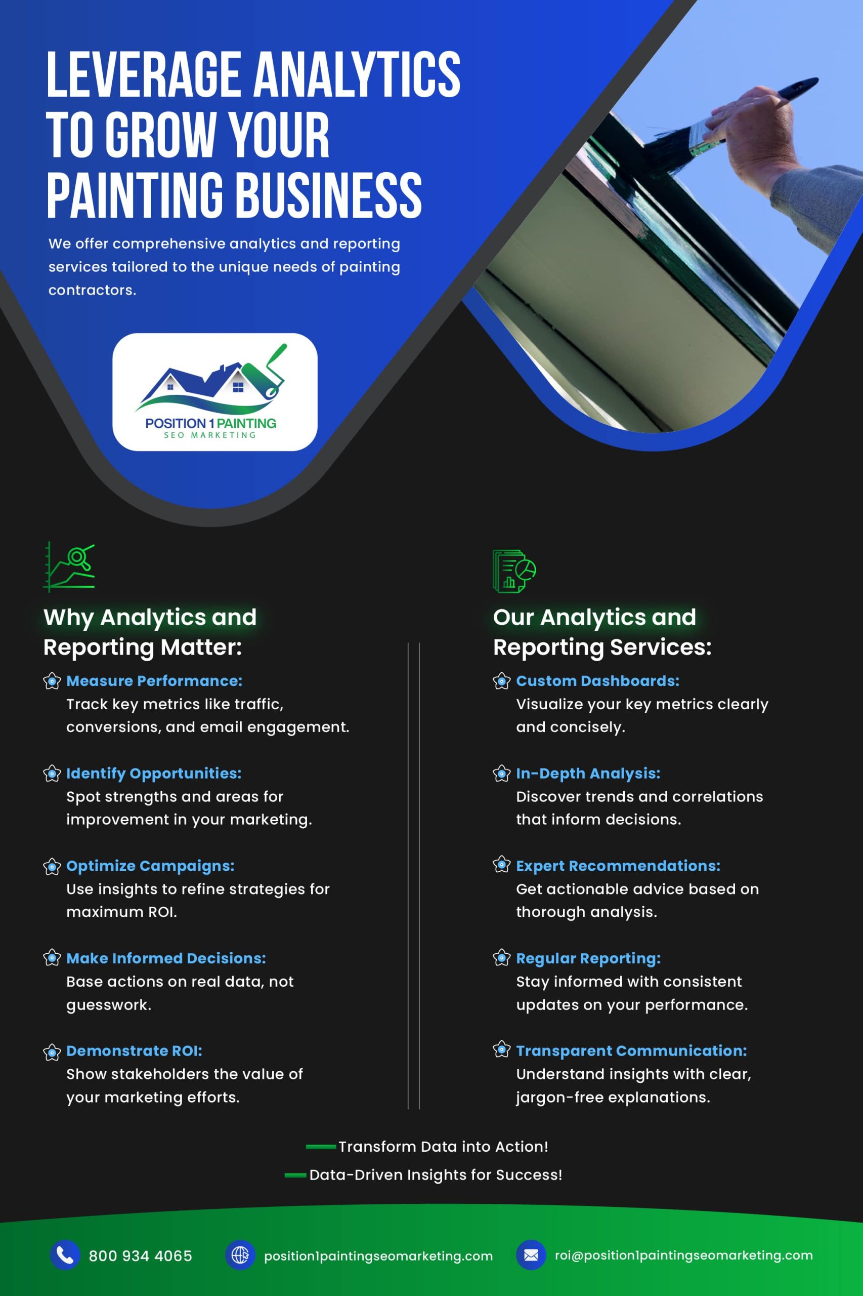In the painting industry, data is your most valuable tool for making informed marketing decisions. Position 1 Painting SEO Marketing understands that tracking, analyzing, and interpreting your marketing performance is crucial for understanding what’s working, what’s not, and where to focus your efforts. We offer comprehensive analytics and reporting services tailored to the unique needs of painting contractors.