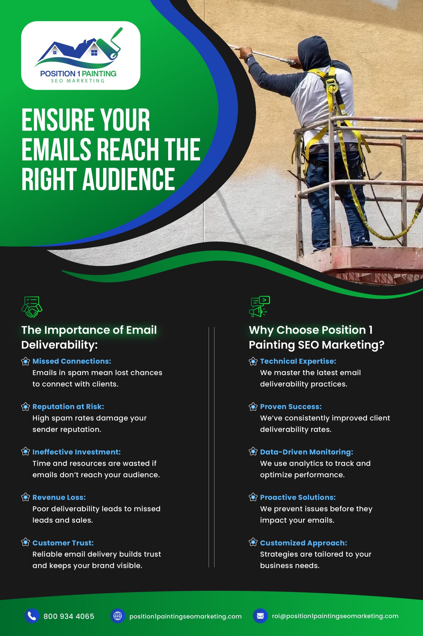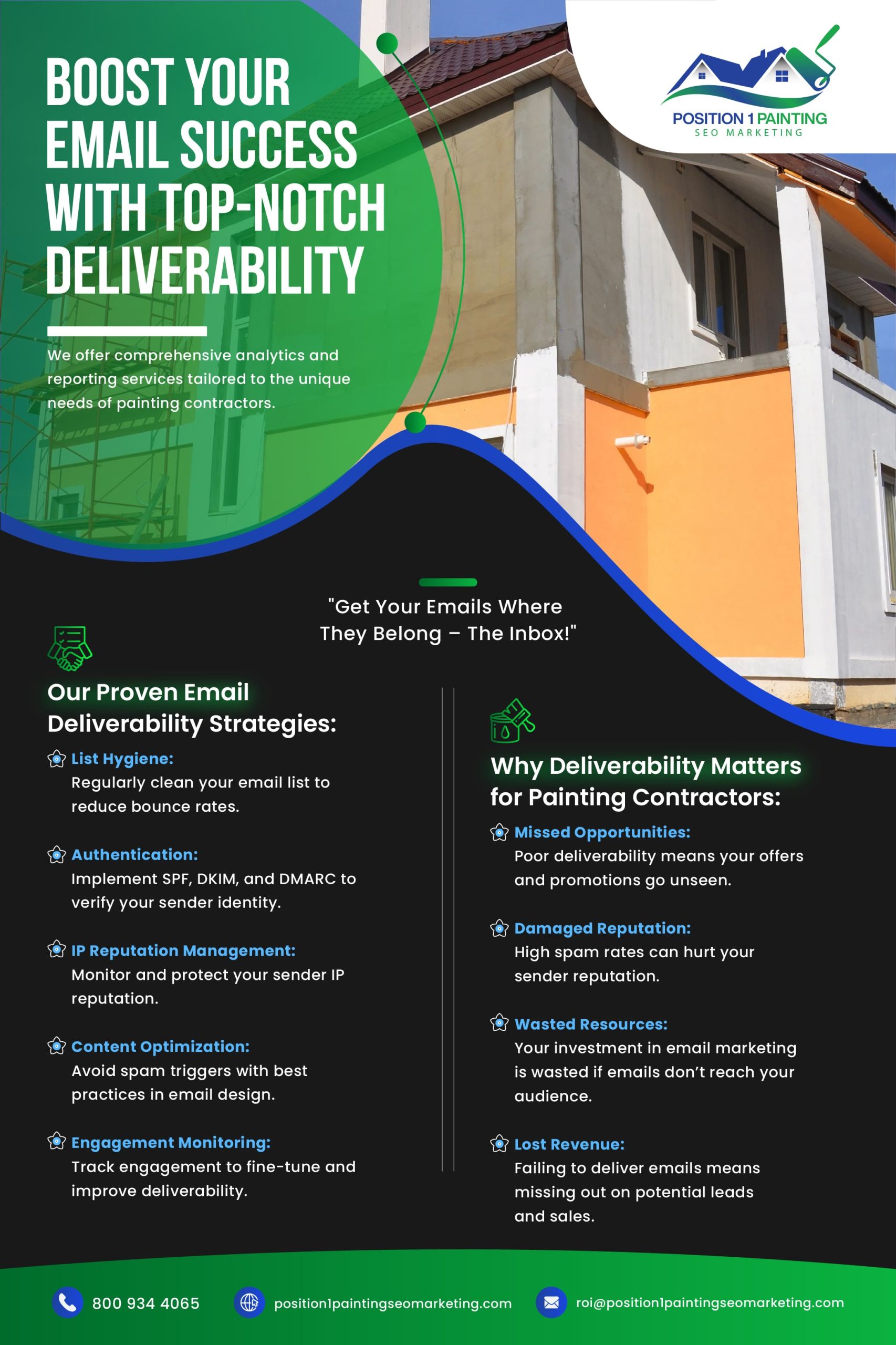 Don’t let your email marketing efforts fall flat due to poor deliverability. Partner with Position 1 Painting SEO Marketing and let us help you reach your audience, build relationships, and drive results through effective email communication.